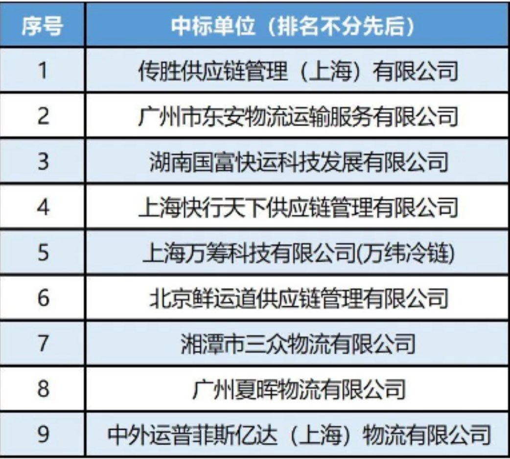 據(jù)介紹,本次招標(biāo)吸引來自全國各地包括順豐、中外運(yùn)、新夏暉、萬緯物流、傳勝供應(yīng)鏈、快行天下等知名企業(yè)在內(nèi)的共57家企業(yè)報名,通過資格審查24家,最終到場參與開標(biāo)的24家(23家現(xiàn)場、1家線上),經(jīng)過評審小組的多輪評審及議價,結(jié)合投標(biāo)單位服務(wù)調(diào)配能力、線路覆蓋網(wǎng)絡(luò)、服務(wù)價格等三方面進(jìn)行綜合考量并最終確定以下9家單位中標(biāo),分別如下: